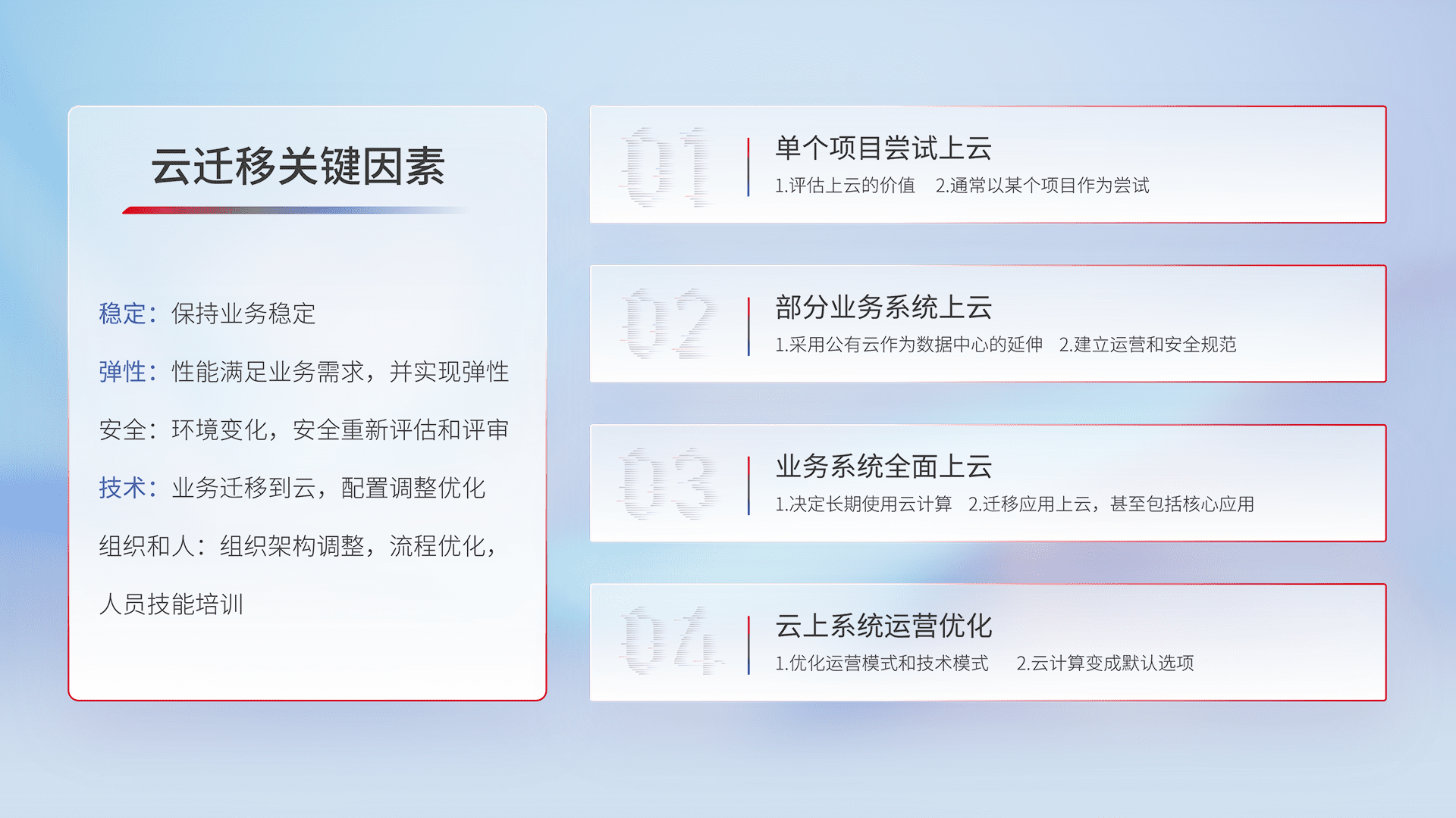 结合实际业务,,,从规划设计、、、、云平台选型、、、、云原生改造、、、数据迁移、、集成交付,,迁移全过程为客户识别最佳上云路径,,,,做好风险识别管理,,设计网络架构、、、、身份权限、、安全审计合规、、操作审计、、、、日志审计、、监控告警策略、、、、多站点容灾设计等,,对云上基础设施进行整体规划,,,,提升IT治理水平,,,,以满足弹性、、、高可用、、高性能的需求。。。