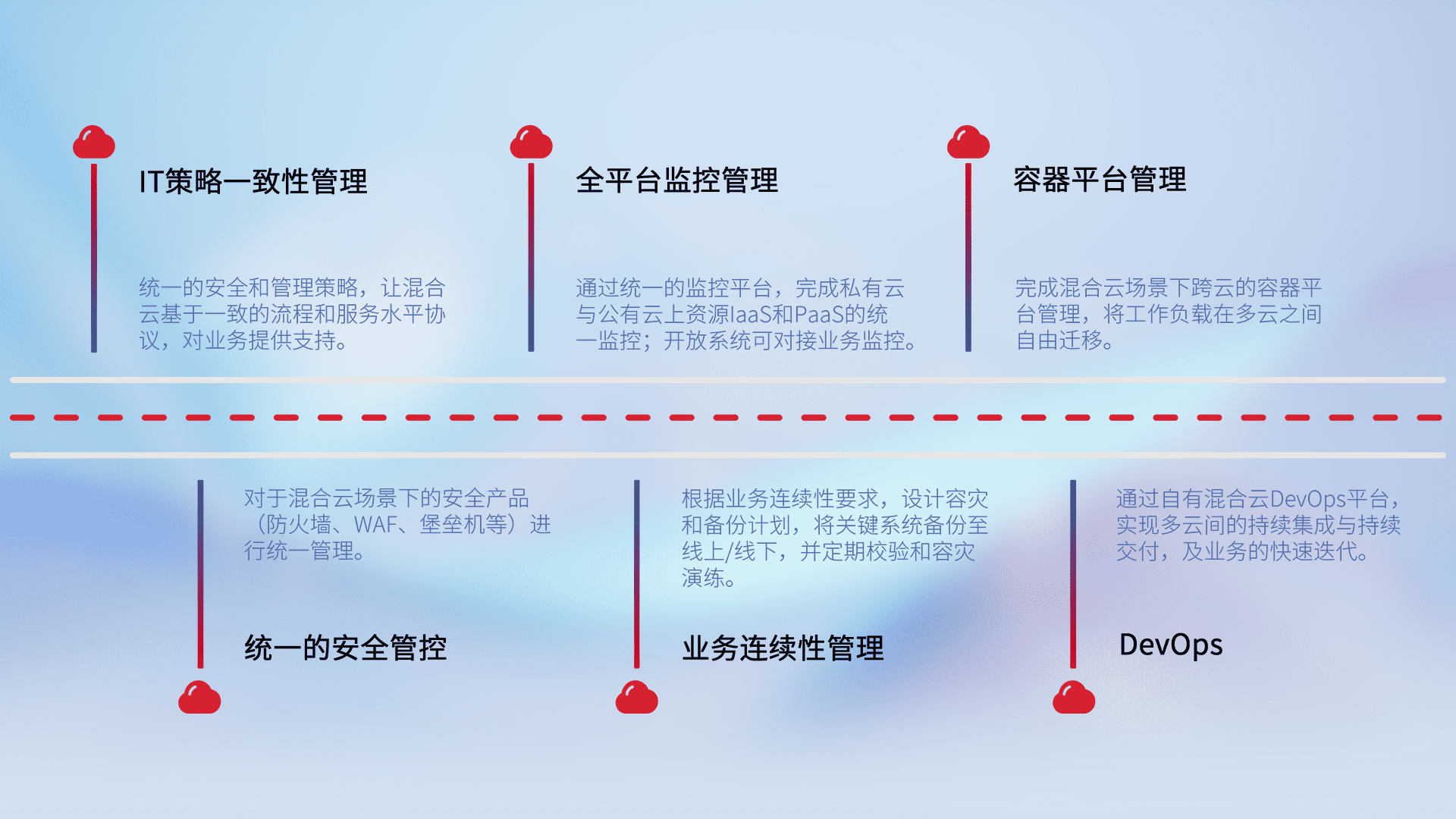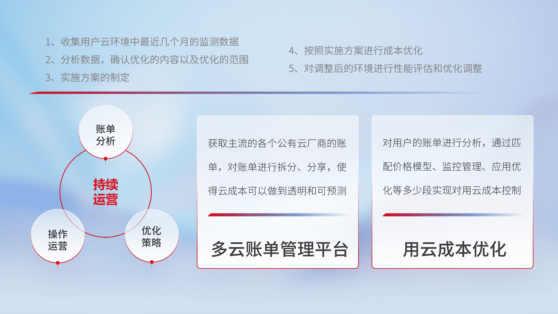 通过多云纳管,,,,以统一的资源数据模型把客户的云资源进行抽象和封装,,进而实现对多云资源的统一操作,,,,保障云资源管理的可靠性、、、稳定性与可用性。。量身定制化运维内容,,,,配置、、、、开发运维、、补丁管理、、、备份、、、、监控、、、认证和访问管理、、、审计和日常巡检等,,,保障在用云过程中的可靠度,,,稳定度以及高可用率。。。。